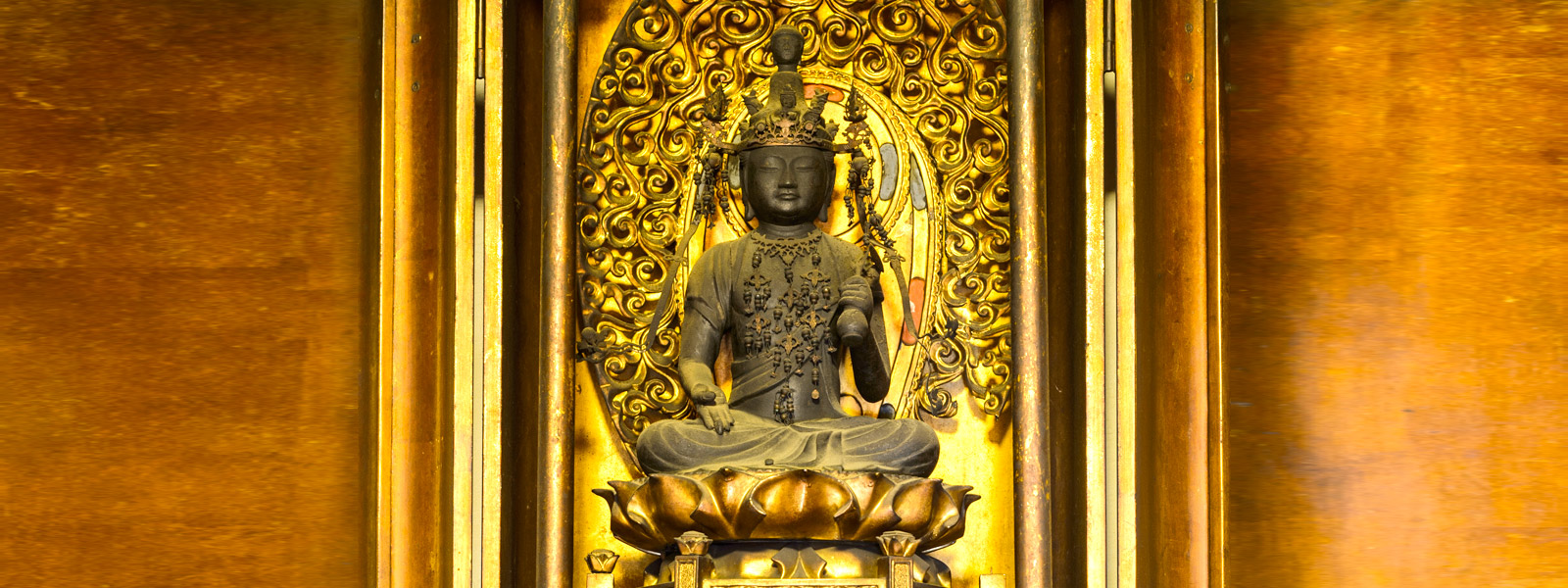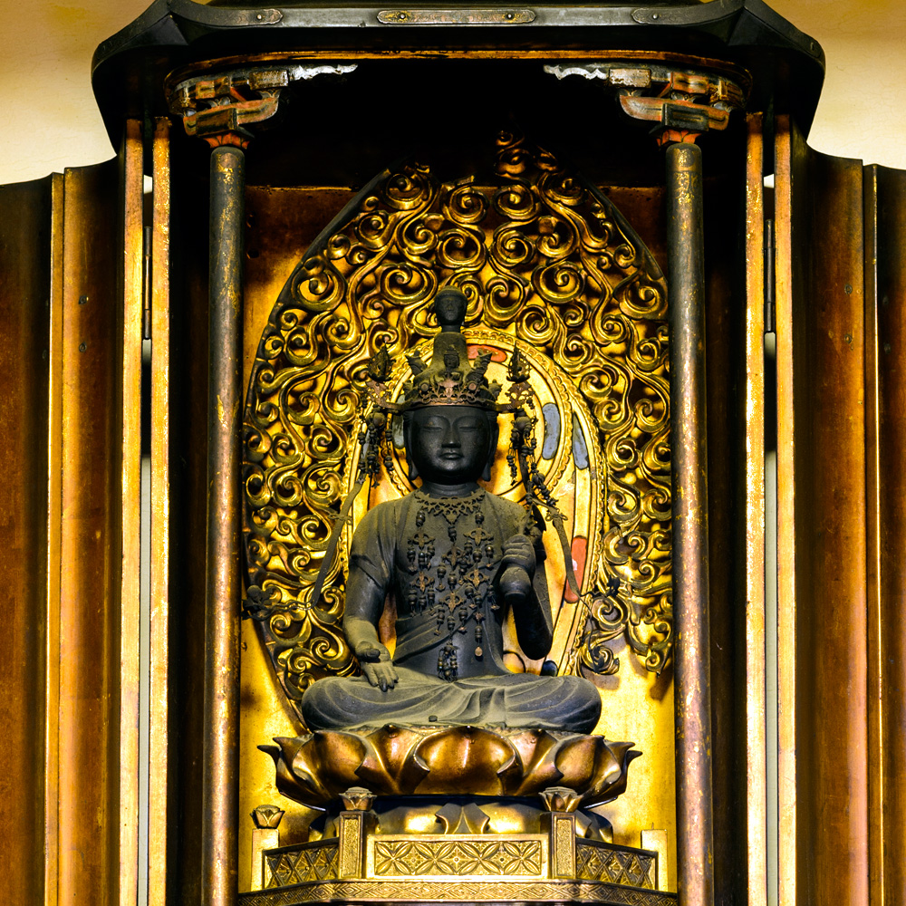 当寺では、聖観世音菩薩を本尊としています。聖観世音菩薩とは、いわゆる観音様の事です。経典のひとつ「観世音菩薩普門品偈」には、観世音菩薩が、この世界を生きる全ての人々の苦しみの声を聞き、相手に応じて三十三の姿に変身して救う事が説かれています。そのため、聖観世音菩薩には、様々な仏様としての別名があります。当寺の本尊は、右手は垂下して施無畏印を結び、左手には蓮華を挿した華瓶(けびょう)を持つお姿をしています。