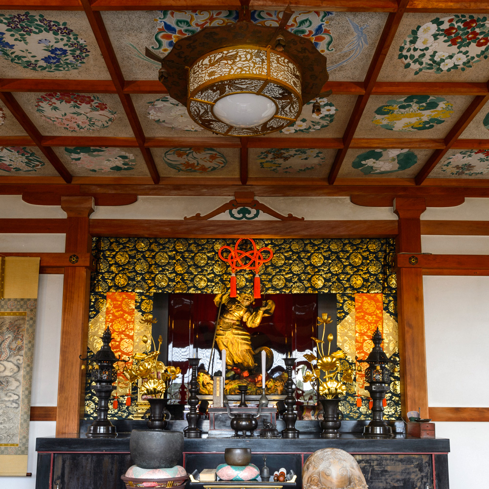 毘沙門堂の正面扁額は弘法大師の直筆で、天井には日本画家初代藤原孚石筆による四季草花48面の絵画が有ります。